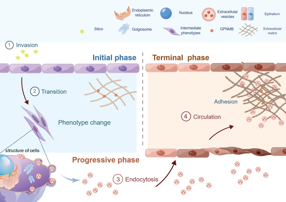 本研究发现矽肺的肺纤维化早期,二氧化硅(SiO2)刺激AT2高表达GPNMB,直接促进上皮细胞间质转化;随着肺纤维化病理进程持续进展,富含GPNMB蛋白的细胞外囊泡(EVs)通过旁分泌机制,间接促进正常上皮细胞发生间质转化,发挥纤维化级联效应。同时,富含GPNMB蛋白的EVs可进一步蓄积在细胞外基质(ECM)上,ECM作为组织的重要组成部分,不仅为肺中的常驻细胞提供了重要的物理支架,而且对肺细胞信号传导也至关重要;最终,上皮来源的的EVs通过体液循环,远距离分泌GPNMB到远端ECM,形成纤维化微环境,持续促进临近细胞发生纤维化样改变。进一步研究发现,ECM胶原重塑和成分变化会招募更多EVs,间接改变ECM成分进而形成纤维化反应的正反馈,因此纤维化ECM通过趋化和黏附EVs放大纤维化效应。