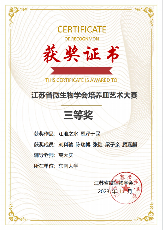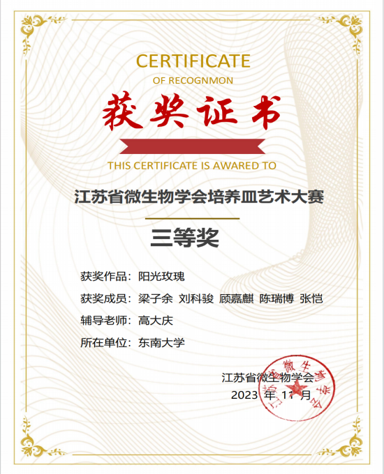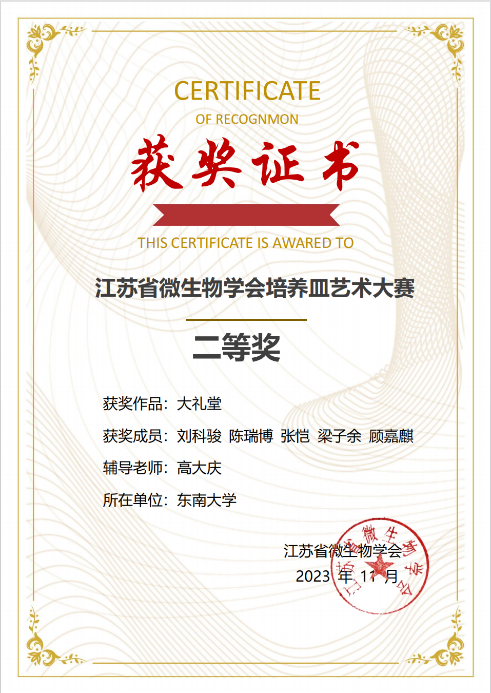 “以微生物为颜料,用培养基当画板”,在9-10月举办的江苏省微生物学会培养皿艺术大赛中,太阳成官网有五位438211班的同学在高大庆老师的指导和带领下积极参与,尽情展现自己的艺术天赋。在创作过程中,几位同学团结一致,通力合作,前后查阅了数十种适合接种的菌种,再结合太阳成集团tyc9728几个较为突出的元素,如大礼堂、校徽等,经历了若干次失败与重创,精益求精,最终创作出了4幅作品。其中《大礼堂》获得了二等奖,其余三幅作品均获得三等奖的好成绩。