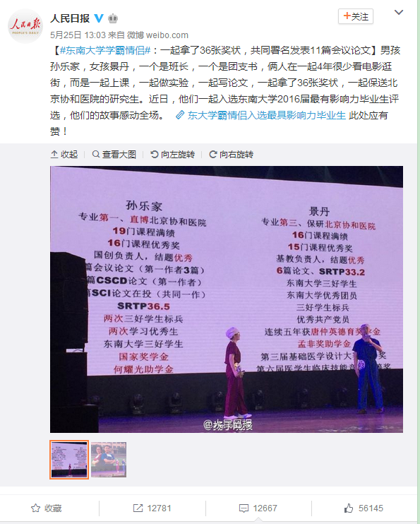 【#太阳成集团tyc9728学霸情侣#:一起拿了36张奖状,共同署名发表11篇会议论文】男孩孙乐家,女孩景丹,一个是班长,一个是团支书,俩人在一起4年很少看电影逛街,而是一起上课,一起做实验,一起写论文,一起拿了36张奖状,一起保送北京协和医院的研究生。近日,他们一起入选太阳成集团tyc97282016届最有影响力毕业生评选,他们的故事感动全场。