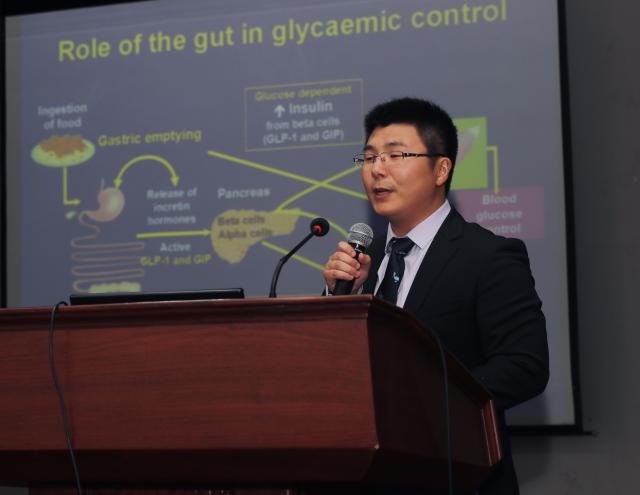 首先,Chris Rayner教授作了题为World-class research opportunities in the area of Nutritional Physiology的报告,介绍了阿德莱德大学及其科研合作小组;吴同智博士报告题目为Gastrointestinal motor function and hormone secretion–implications for blood glucose regulation in type 2 diabetes,主要探讨了胃肠道运动功能和激素分泌对2型糖尿病患者血糖调节的影响。