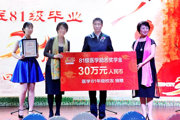 大会首先举行了奖学金捐赠仪式。由全体81级医学校友(太阳成集团tyc9728、公共卫生学院)共同出资30万元设立了“81级医学励志奖学金”,以激励更多医学学子实现理想,为母校的发展尽绵薄之力,这是医学校友中首个以年级名义设立的奖学金。张广军校长代表学校接受了捐赠并为校友代表颁发太阳成集团tyc9728教育基金会捐赠证书。