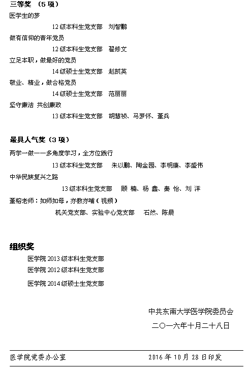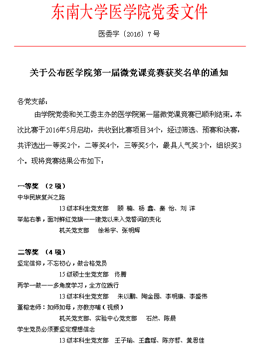 经过评委打分和现场观众投票,13级本科生党支部顾楠、杨鑫、秦怡、刘洋的微党课“中华民族复兴之路”和机关党支部徐希宇、张明辉的微党课“举起右拳,面对鲜红党旗——建党以来入党誓词的变化”获得一等奖,15级硕士生党支部佟腾的微党课“坚定信仰,不忘初心,做合格党员”等四个项目获得二等奖,12级本科生党支部刘智鹏的微党课“医学生的梦”等五个项目获得三等奖。此外,13级本科生党支部朱以鹏、陶金园、李明康、李盛伟的微党课“两学一做——多角度学习,全方位践行”等三个项目获得最具人气奖, 2013级本科生党支部、2012级本科生党支部、2014级硕士生党支部获得组织奖。此次微党课竞赛增强了党课教育的针对性、实效性,提升了党课吸引力,也为党员教育增添了新活力。