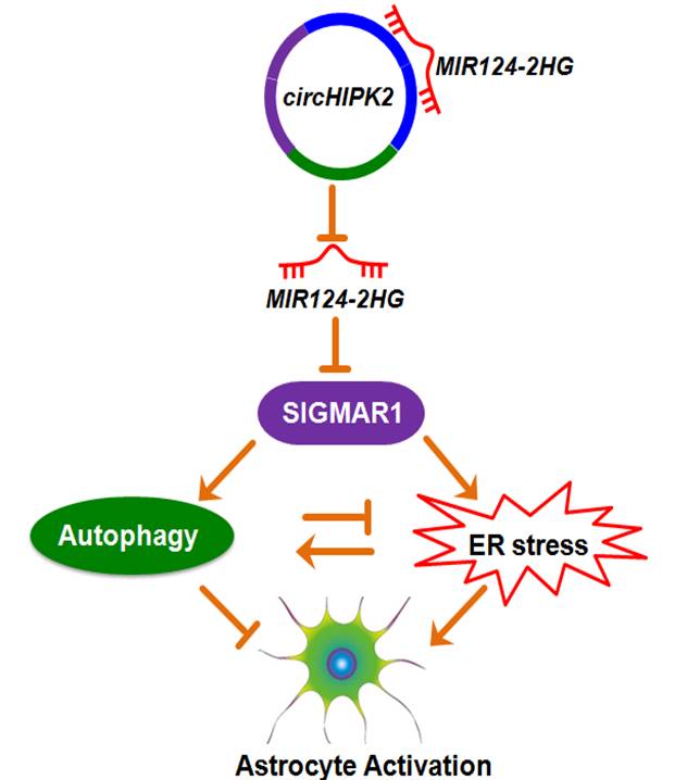 该研究探讨circHIPK2/miR-124/σ-1R轴在星形胶质细胞活化中的作用。课题组前期研究结果表明,σ-1R在星形胶质细胞活化中发挥重要作用,为进一步探讨σ-1R的上游调控分子,使用生物信息学预测,发现miR-124可能参与σ-1R调控。体内体外实验表明,miR-124通过σ-1R抑制星形胶质细胞活化。同时,生物信息学预测发现circular RNA HIPK2(circHIPK2)存在miR-124的结合位点。实验结果表明circHIPK2能够作为miR-124海绵,降低miR-124的生理活性,参与星形胶质细胞活化。此外,细胞自噬和内质网应激也参与对星形胶质细胞活化的调控。全文阐述了circHIPK2/miR-124/σ-1R轴通过协同调控自噬和内质网应激,最终调节星型胶质细胞活化过程。