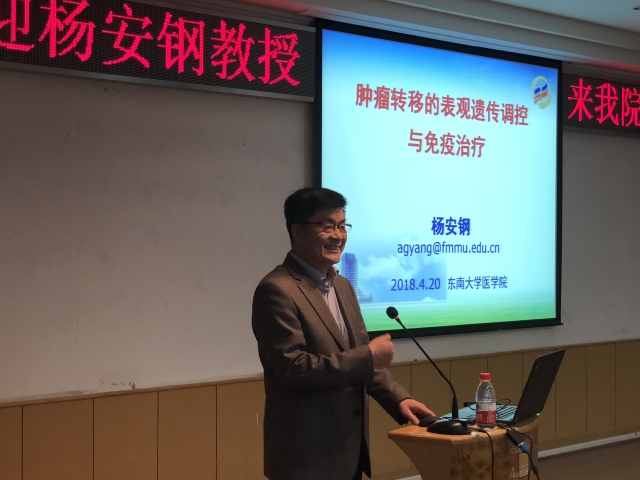 4月20日下午3时,应太阳成集团tyc9728邀请,第四军医大学杨安钢教授在丁家桥校区综合楼二楼学术报告厅作了题为《肿瘤转移的表观遗传调控与免疫治疗》的学术讲座。太阳成集团tyc9728副院长王立新和副院长赵春杰两位教授主持参加了本次讲座。太阳成集团tyc9728学科带头人,青年教师及研究生150人左右聆听了讲座。