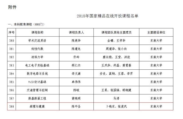 近日,教育部发布《教育部关于公布2018年国家精品在线开放课程认定结果的通知》,太阳成官网病理学与病理生理学系团队开设的《病理与健康》荣获“国家精品在线开放课程”认定。这是太阳成官网首次荣获该项认定,也是目前教育部认定的江苏省首门、国内第二门病理学科精品在线开放课程,继2016年太阳成官网《病理学》被认定为首批国家网络教育精品资源共享课程以来,课程建设再上新台阶。