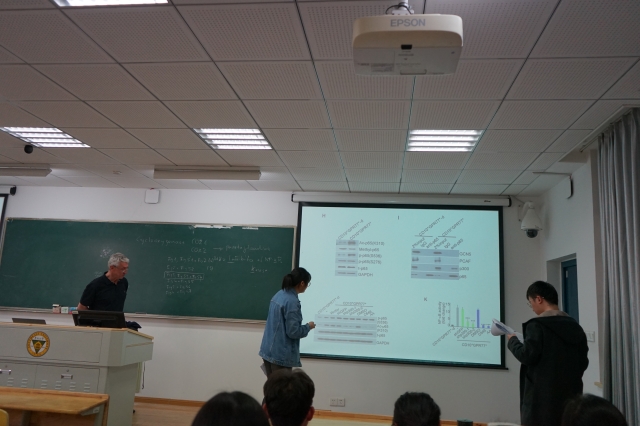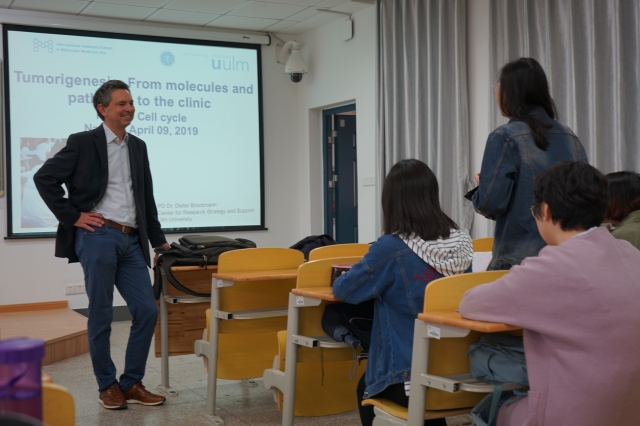 德国乌尔姆大学与太阳成集团tyc9728联合举办的“春季课堂”于2019年4月14日在太阳成集团tyc9728丁家桥校区圆满结束。本次“春季课堂”从4月9日持续至4月14日,为期六天。来自德国乌尔姆大学的六位教授延续历年传统,为太阳成集团tyc97282016级拔尖创新班的同学们带来了主题为“Tumorigenesis: From Molecules to pathways”的系列分子医学相关课程。本次课程更偏向于对肿瘤发生机理的探讨与阐释,内容以细胞增殖周期为基础,涉及到信号转导、炎症反应、生长因子、蛋白激酶、端粒等与细胞的恶性转化、肿瘤的发生发展息息相关的内容,为同学们在肿瘤形成方面做了较为详尽的介绍。课程最开始Dr. Brockmann和Prof. Kühl分别介绍了细胞周期的调控与失控,以及涉及不同生长因子及信号转导方式的信号通路对细胞周期的影响,为课程的学习打下基础。而Dr. Kestler带来了以研究生物系统组成成分的构成与相互关系和以系统论和实验、计算方法整合研究为特征的系统生物学课程,给同学们提供了一种新思路。在接下来的几天里Dr. Günes, Prof. Wirth和Dr. Azoitei通过对端粒、炎症反应及蛋白激酶的讲解,揭示了其在肿瘤发展中起到的关键作用。