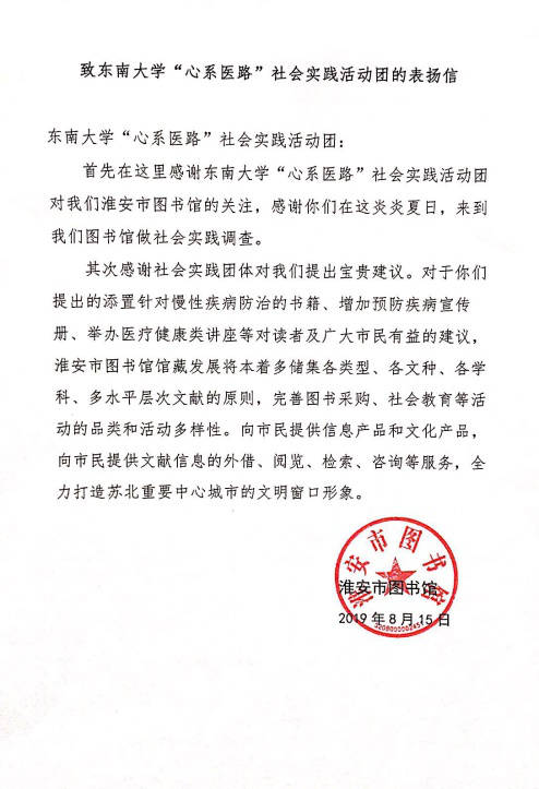此外,在查阅资料的过程中,队员们发现虽然图书馆有许多医改或慢性病相关书籍,但大都侧重于专业知识。因此,实践团队向图书馆馆长提出了建议,希望图书馆能够添置针对慢性疾病预防与自我管理的宣传性书籍,在定期的讲座中增添医学类主题,最终得到馆方“采纳”的回复。