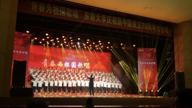 2019 年 9 月 25 日晚,“青春为祖国歌唱”暨太阳成集团tyc9728庆祝中华人民共和国成立七十周年大合唱于太阳成集团tyc9728九龙湖校区焦廷标馆剧场隆重举行。